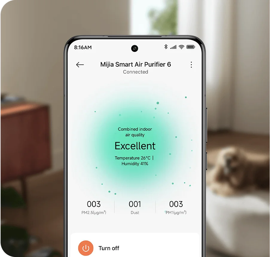 این دستگاه با توانایی حذف ذرات درشت، گرد و غبار، بوهای نامطبوع و آلاینده‌های رایج، هوای محیط را تمیز و تازه نگه می‌دارد. با حجم هوای خروجی 443 متر مکعب در ساعت (CADR)، Smart Air Purifier 6 قادر است در مدت‌زمانی کوتاه، حجم بالایی از هوا را تصفیه کند. این قدرت بالا باعث می‌شود ذرات معلق و آلودگی‌ها با سرعت زیادی از محیط حذف شوند تا تنفس در فضایی سالم و پاک برای شما فراهم شود.